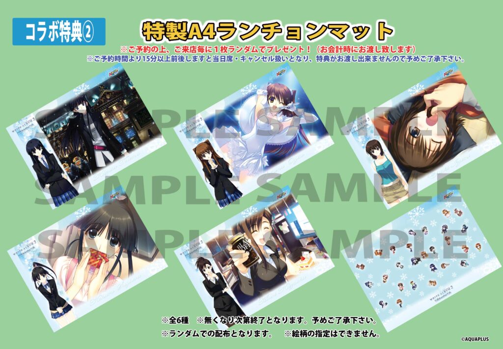 開催中コラボカフェ ■2026年1月17日~3月1日で 『WHITE ALBUM2』15周年コラボカフェを開催致します! 作中に登場した料理や、ドリンク等をご用意しております! ご予約はこちらから※ご予約日の1週間前より受付開始 ●フードメニュー ■ドリンクメニュー ●特典 ●グッズ
